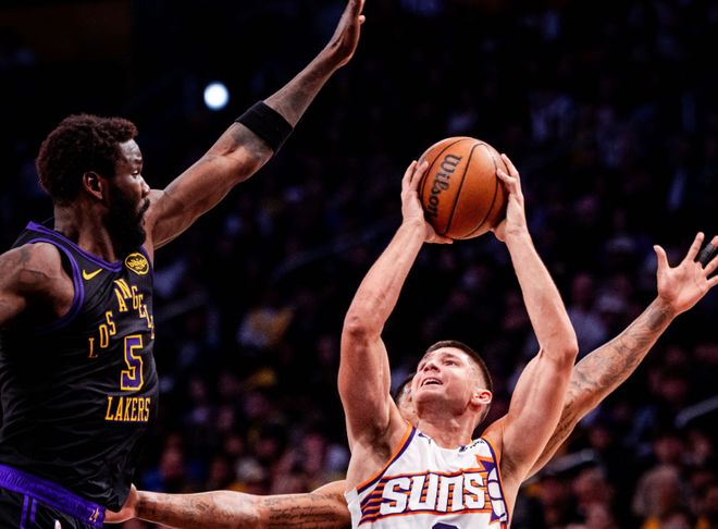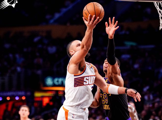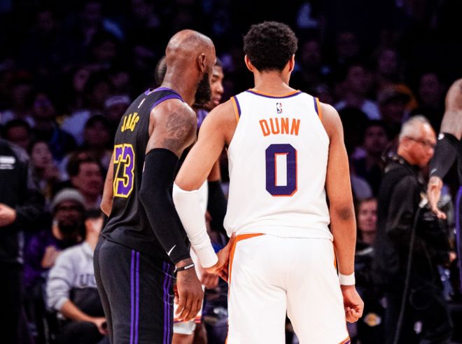 昨日和勇士的比赛,詹姆斯带动艾顿和拉拉威亚爆发,在东契奇和里夫斯重伤缺阵的情况下,湖人进攻整体发挥没有下降,就连布朗尼都承担起替补席发动机角色。关键是湖人这两场比赛不能犯错,给斯玛特留足够的养伤空间,确保季后赛首轮能够撑起防守一片天!此外,詹姆斯也实现生涯23个赛季,均达成场均至少20+5+5!而NBA历史上,其他球员最多只做到过10次!回到本场比赛,湖人迎来好消息,斯玛特回归,而布克本场比赛轮休!开场八村塁拉杆上篮,吉莱斯皮和老詹对轰三分,阿伦再中三分后,老詹造三分犯规!