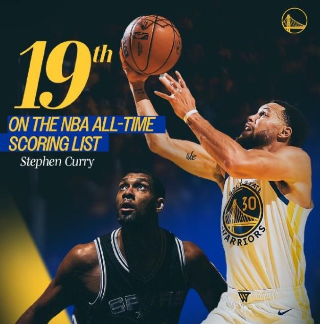 此役库里也达成了一项新的里程碑,他的NBA生涯总得分超越邓肯,升至历史第19位。