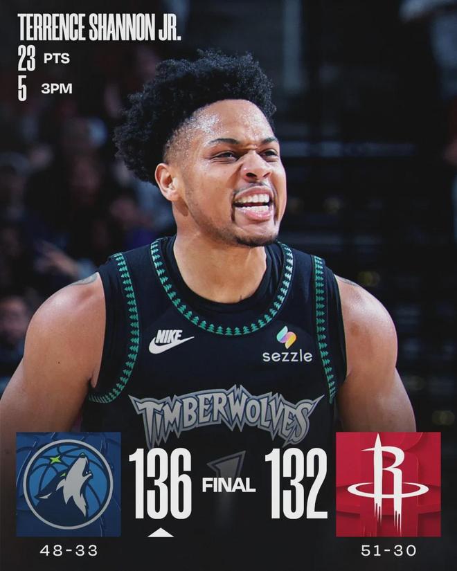 先看火箭和森林狼在这场对决,四节比分(森林狼在前):37-36、32-37、34-33、33-26,火箭又是末节崩盘!火箭后卫阿门-汤普森出战41分40秒,投篮22中17,三分1中0,罚球7中7,空砍41分9篮板7助攻1抢断1盖帽。