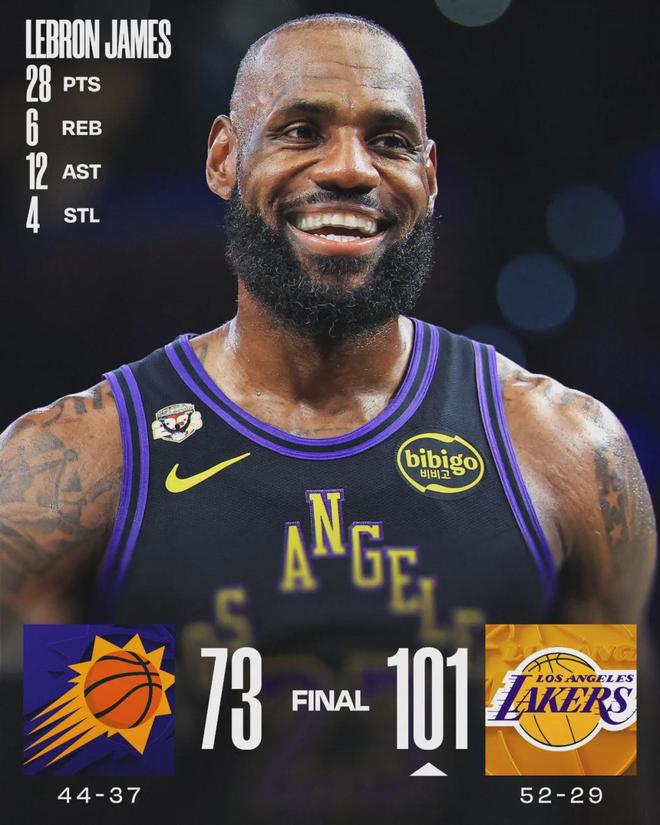 掘金和雷霆的比赛,没有太多好写的,双方都是替补阵容。约基奇还差1场才能评奖,收官战必须出战15分钟以上。文班已经达到65场,收官战很可能轮休。最后说说湖人和太阳这一场,詹姆斯16投10中砍下28分6篮板12助攻4抢断。