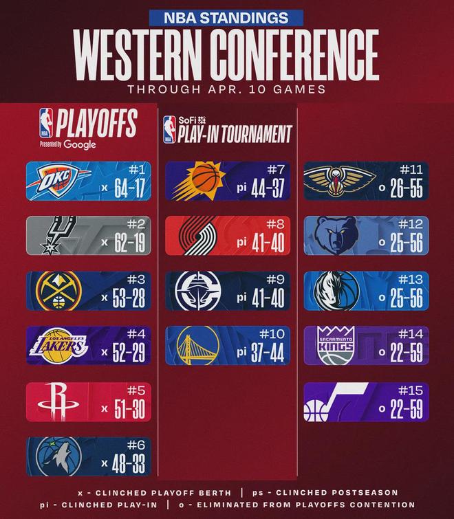 北京时间4月11日,NBA安排了15场常规赛,其中有几场关注度比较高:火箭132-136不敌森林狼;快船97-116不敌开拓者;掘金127-107大胜雷霆;湖人101-73大胜太阳。这样一来,掘金和湖人锁定西部前四,火箭锁定西部第五。