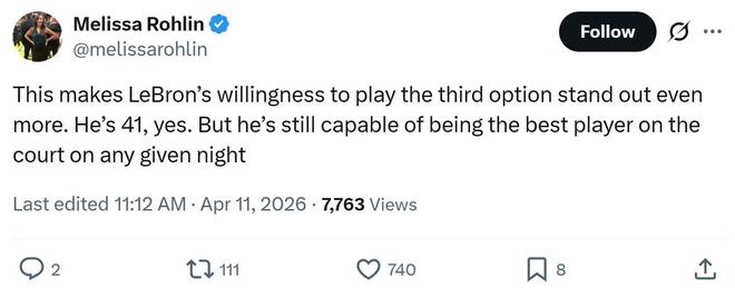 正如赛后湖人队记Melissa Rohlin所说:“詹姆斯这样的表现让他愿意担任第三进攻选择变得更加耀眼,尽管他已经41岁,但他仍然有能力在任何一场比赛中成为场上最好的球员。”