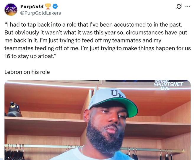 詹姆斯赛后被问到相关问题时坦言:“我不得不重新扮演过去习惯的角色,很显然,今年的情况有所不同,是环境迫使我回到了这个位置,我只是试图和队友相互激励,持续保持竞争力。”