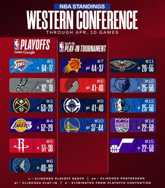 这样一来,西部最终的排名其实呼之欲出,大概率将是1雷霆、2马刺、3掘金、4湖人、5火箭、6森林狼、7太阳、8开拓者、9快船和10勇士。