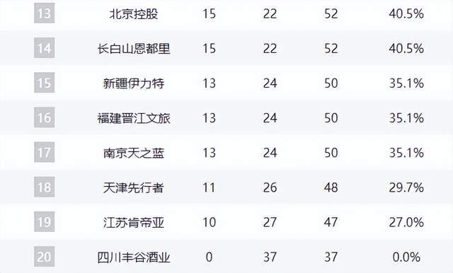 第十二至十四名球队仍保留季后赛希望,竞争格局高度胶着。北控男篮四连败后彻底丧失主动权,被广州龙狮反超,季后赛前景黯淡;吉林东北虎虽输球,但与身前球队胜场差距未被拉大,仍存理论可能。新疆广汇因主力伤病频发,阵容深度受限;福建浔兴三连败,士气低迷;南京同曦在关键卡位战中不敌广州,错失翻身良机,三队虽仍落后2个胜场,但当前状态与赛程难度使其冲进前十二的希望渺茫。
