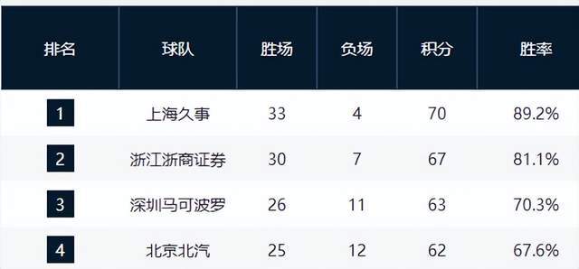 北京时间4月12日消息,CBA第37轮战罢,联赛争冠与季后赛席位格局进一步明朗。上海久事与浙江广厦延续强势,双双保持不败,分别稳居积分榜前两位,黑马深圳马可波罗紧随其后,三队胜场优势明显,前三位排名已无悬念,争冠格局基本定型。