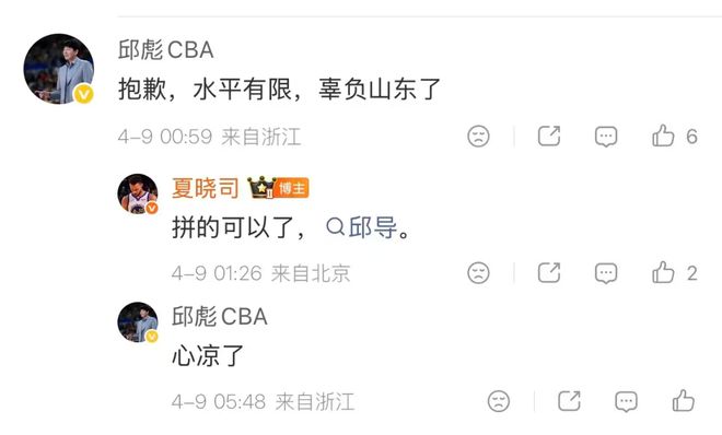 上一轮山东以6分之差惜败广厦的赛后,邱彪在社媒表示:“抱歉,水平有限,辜负山东了。”山东媒体人回复:“拼的可以了,邱导。”但邱彪的回应是:心凉了。