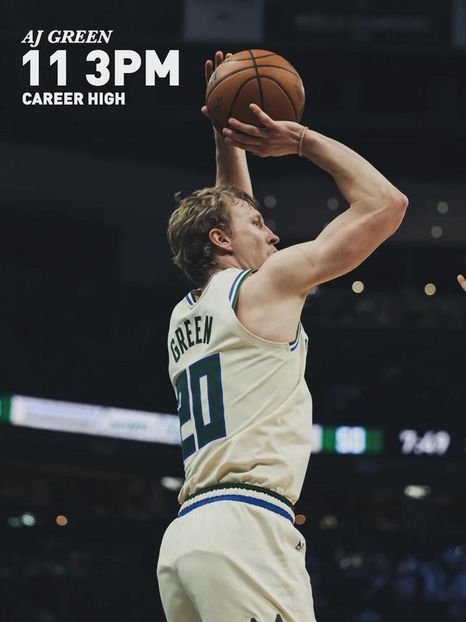 AJ-格林单场命中11记三分,打破雄鹿队史纪录,此前是由雷阿伦(2002年)和利拉德(2024年)共同保持的10记。 AJ-格林本赛季命中227记三分,超越马利克-比斯利(224)升至队史第二,仅次于雷阿伦的229记(2001年)。