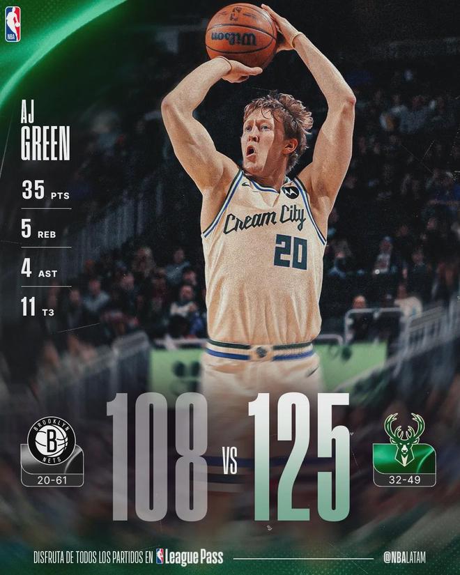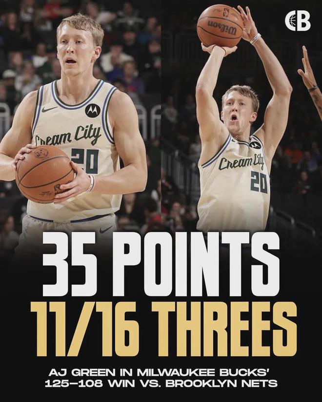 雄鹿125-108大胜篮网,雄鹿射手AJ-格林开启暴走模式,第四节连中5记三分,单节砍下17分。全场比赛,AJ-格林三分16中11,罚球2中2,狂轰35分5篮板4助攻2抢断,正负值+29全场最高。单场35分生涯新高,此前只有27分。