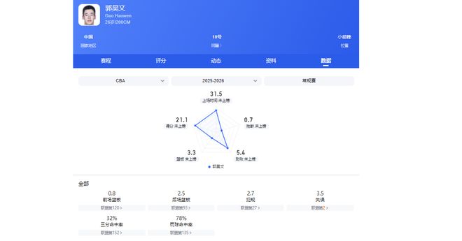 郭昊文本赛季效力于同曦男篮,31次出场后,场均21.1分5.4助攻3.3篮板,暂时是本土得分王,能力非常突出。