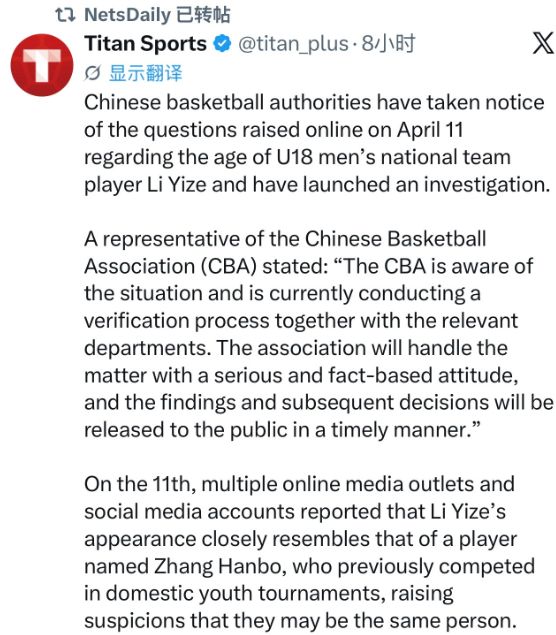这不,就连篮网媒体NetsDaily也转发了这次改年龄的报道,只能说这次中国篮球丢人丢大了。