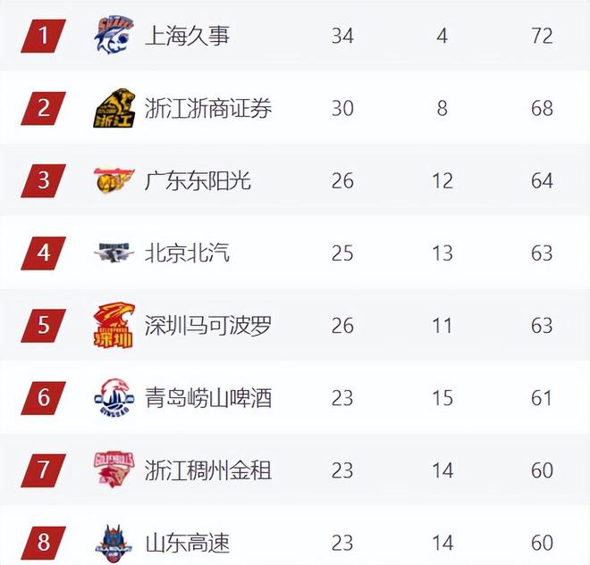 青岛本轮击败了宁波,目前也拿到2连胜暂时来到第6,输球的宁波遭遇4连败,落后第8,晚赛一天的山东多达3分,基本上已经无缘冲击前八了。