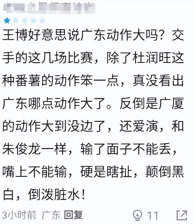 看到王博这样说,赛后浙江球迷不干了,直言:不是防守体系被打穿,是你根本就没有防守体系;就没人能对的上奎因这点。广东球迷回应:护框比广东还拉的球队不多了;并且还有球迷反讽王博:还好意思说广东队动作大吗?