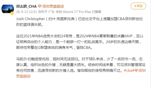 根据郑志鹏报道:“克里斯托弗是2021年NBA选秀大会的24号秀,他在2024年NBA夏季联赛收获决赛MVP,足以证明其突出的个人能力。克里斯托弗是一个能够一打一的乱战高手,24岁的乐透边缘天赋,期待他带着在G联盟练级的满身杀气,登陆CBA。”