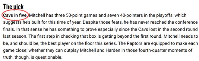 但也有相反的观点:骑士去年还是东部头号种子,本赛季又通过引进哈登进一步补强,哈登出战时球队战绩为19胜6负。与此同时,猛龙避免了赛季末段崩盘,也不用打附加赛,胜场比上赛季多了16场,士气正盛地闯入季后赛。