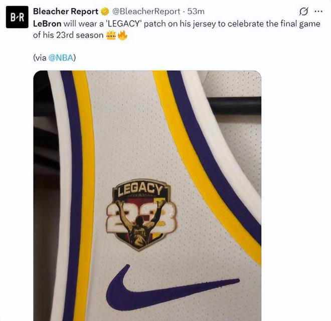 根据美媒报道,由于本赛季是詹姆斯第23个赛季的常规赛最后一战,在他的球衣上特意增加了一个图案徽章,上面写了一个词“Legend(传奇)”。