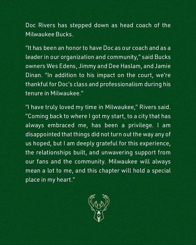 雄鹿老板韦斯-伊登斯、吉米-哈斯拉姆与迪-哈斯拉姆夫妇,以及杰米-迪南表示:“里弗斯担任我们的主教练,同时作为球队和社区的领袖,这是我们的荣幸。除了他在赛场上带来的影响力之外,我们也感谢他在密尔沃基任职期间展现出的风度与职业素养。”