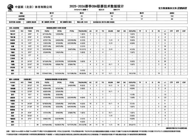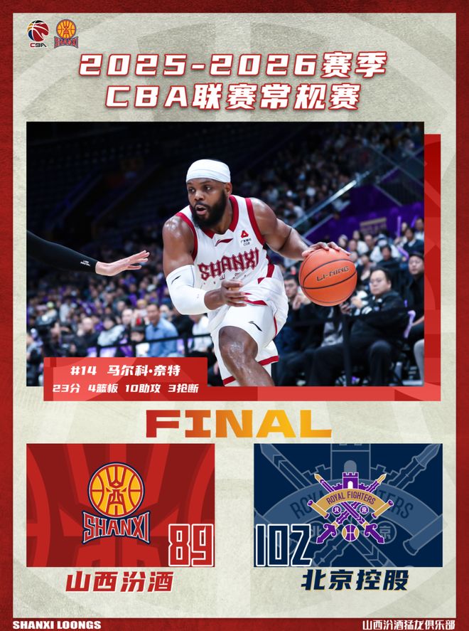 北京时间2026年4月13日19:35,2025-2026赛季常规赛第38轮继续进行,山西汾酒赴客场挑战北京控股。两队历史上共交手24次,山西汾酒14胜10负。上赛季两队交手2次,山西汾酒1胜1负;本赛季两队交手1次,山西汾酒1胜0负。本场比赛,山西队发挥不够稳定,只打了两节好球,首节和末节防守松懈,无法有效限制对手得分。场上专注度不足,篮板球保护不佳,最终失利,全场比赛结束,山西汾酒89:102不敌北京控股。