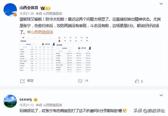 媒体人“山西全体育”发文点评说道:篮板球又输啦!防守太松啦!最近这两个问题太明显了。这直接反映出精神状态。尤其是张宁,伤愈归来后,攻防两端没有表现,斗志没有啦,这场更是0分。都该好好谈话了。