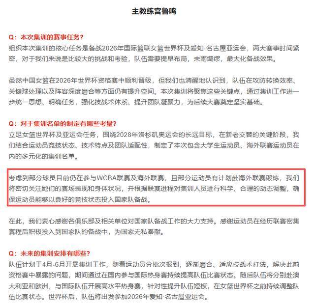 在人员选拔上,宫鲁鸣展现出极强的独立判断力。29岁的老将张曼曼虽即战力逊于王思雨,仍被坚定征召,打破“年龄即上限”的惯性思维;而曾是主力的张茹则意外落选。外界曾猜测其因世预赛表现低迷遭弃,但宫鲁鸣团队明确回应:张茹因伤势未愈,且其所属四川女篮正征战WCBA总决赛,为保障其康复与竞技状态,国家队选择暂缓征召,而非简单裁撤。这一决定体现“动态调整”理念——名单非最终版,张茹等球员将根据联赛进程与身体恢复情况,获得回归机会。