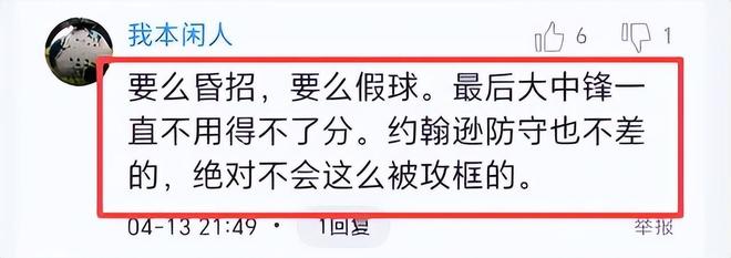 赛后球迷纷纷评论,浙江队是有意战略放弃,有的说“高度怀疑是假球”,有的说“不用怀疑,就是真的”、“要么昏招,要么假球。最后大中锋一直不用得不了分。约翰逊防守也不差的,绝对不会这么被攻框的”、“教练不会不知道,第四节上约翰逊内线是巨大优势”、“约翰逊CBA大杀器就用13分钟,主教练装13。”所以说,这场比赛,浙江队主教练为在季后赛选择对手,避开与上海队同区,“装”的可能性极大。你们说呢?有何看法?