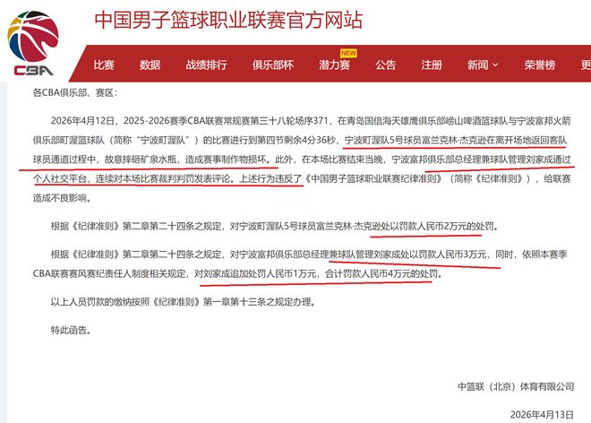 昨晚,CBA公司开出了一份大罚单,对宁波队外援杰克逊,罚款20000元;对宁波队总经理刘家成,罚款40000元。就这样,CBA公司的一纸罚单,宁波队2人一共就去掉了60000元。