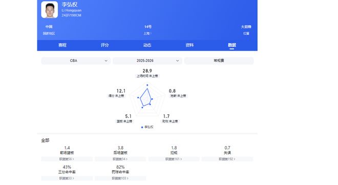 截至第38轮,李弘权已出场36次,场均出场时间29分钟,暂时全队最高,同时场均能得到12.1分5.1篮板,三分命中率高达43.3%。其表现在本土球员中也是非常出色的。