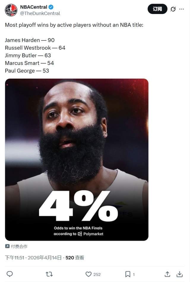 北京时间2026年4月15日,NBA常规赛此前已经全部结束,附加赛打完之后,季后赛正赛就要正式开打。最近美媒NBA Central今日晒出一组有趣的数据,那就是现役没有拿到冠军的球员中季后赛胜场数的前五名,具体的排名分别是1.哈登90胜、2.维斯布鲁克64胜、3.巴特勒63胜、4.斯玛特54胜、5.乔治53胜。