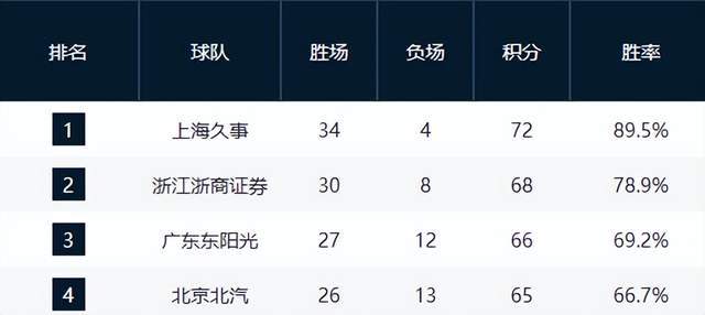 目前,上海久事以34胜4负的傲人战绩提前锁定常规赛冠军,并已取得19连胜,收官阶段有望以全胜战绩收官。卫冕冠军浙江广厦以30胜8负位列第二,虽无缘榜首,但领先身后的广东、深圳三场胜差,位置稳固。