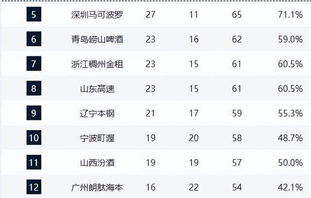 季后赛席位已基本明朗:前九名球队全部锁定名额。青岛队(23胜16负)位列第六,浙江稠州(23胜15负)与山东高速(23胜15负)因少赛一场暂列第七、第八,仍有上升空间。辽宁本钢(21胜17负)稳居第九,确保季后赛资格。