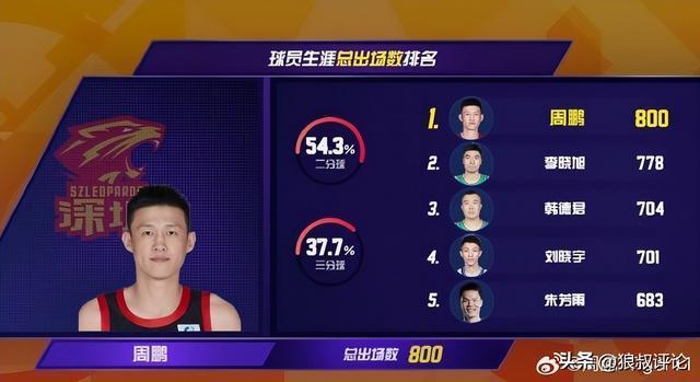 周鹏这场比赛还有另一层意义。这是他个人常规赛第800次出场,也是CBA历史上首位出场数达到800场的球员。原本这个成就,在两场前就能完成,考虑到身体调整需要,他轮休了两场,直到对阵新疆队才复出。