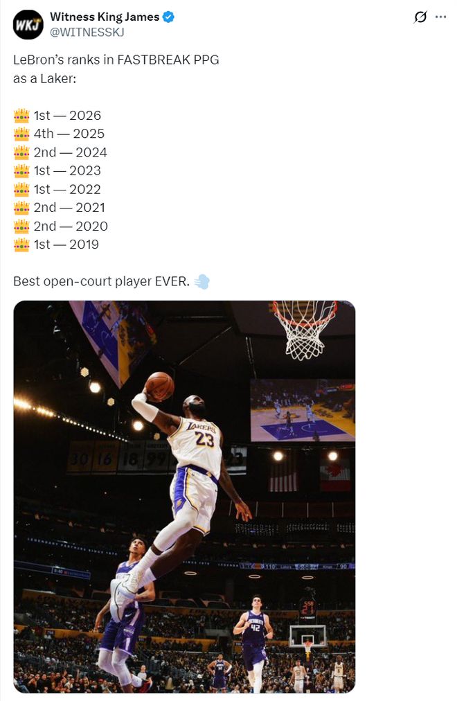 数据媒体晒出自2019年勒布朗加盟湖人后,他在快攻这项数据上从未掉出联盟前十,最差的就是上赛季第四,还有两次第二,其余的5次都是联盟第五,勒布朗就是NBA历史最强快攻球员。