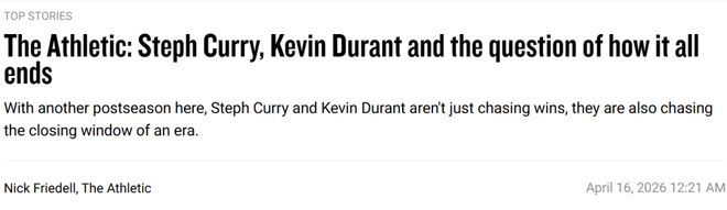 北京时间4月16日,勇士将在附加赛对阵洛杉矶快船,这或许会成为库里本赛季的最后一场比赛。回望一路走来的篮球生涯,库里满怀感慨与珍惜。他的前队友杜兰特,也有类似的体会。The Athletic采访这两位超巨,谈及他们逐渐走向尾声的传奇生涯。