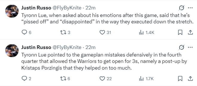 泰伦卢在采访中谈到这场比赛,他表示:气死我了,这场比赛本来被我们牢牢控制着,我们发生了很多愚蠢的失误与低级的执行。比赛还剩10分钟我们曾领先13分,我对球队的表现感到失望。