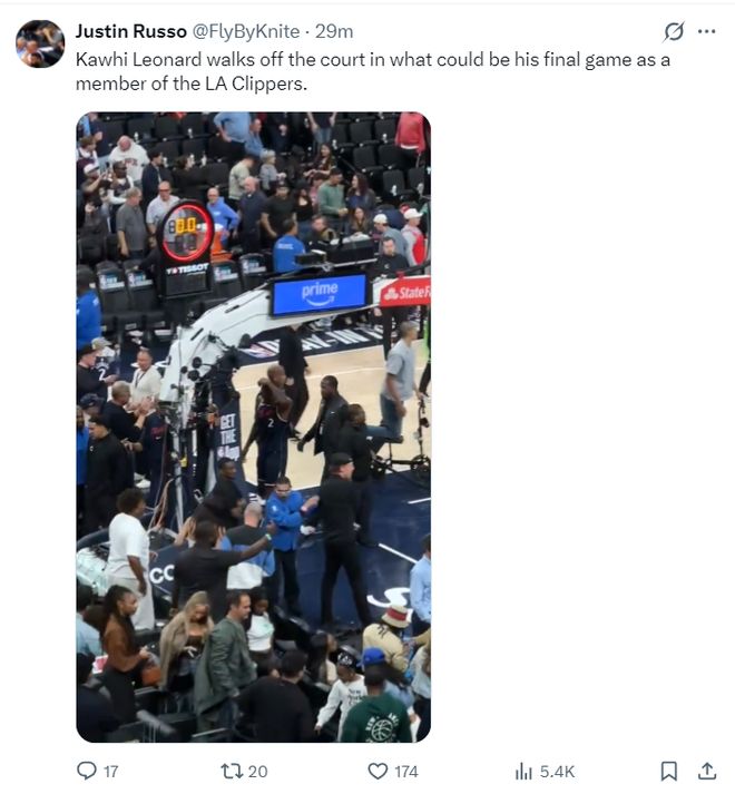 比赛结束后,伦纳德跟勇士球员握手致意,随后他没有停留直接进入了更衣室,快船记者Justin Russo写道:伦纳德直接离开球场,这或许他快船生涯的最后一场比赛。