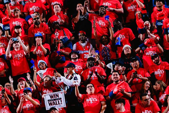 这场比赛快船主场将球馆布置成红色的海洋,在快船的因图特圆顶球馆给客场作战的金州勇士较大的视觉冲击力。科怀-伦纳德当然就是红色海洋的第一核心,他首节6中2拿到6分4篮板3助攻很全面。