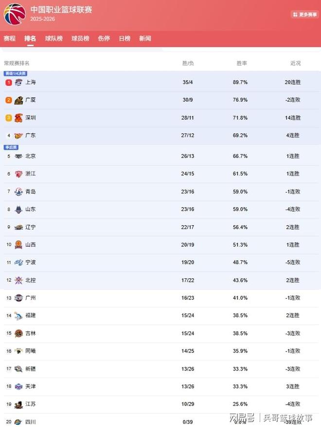 上海队豪取20连胜,以35胜4负锁定联赛第1,本赛季他们不仅是战绩最佳,还有望追平球队的连胜纪录,23连胜!