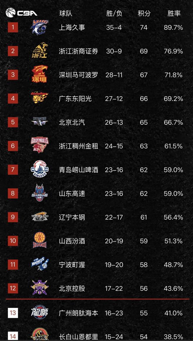 CBA常规赛前39轮的比赛已经全部完赛了,这一轮的比赛对于季后赛的卡位和争夺都非常关键,目前常规赛还有最后三轮的比赛,前十一支球队已经全部确认,现在北控和广州队之间第十二名的争夺还是非常激烈,肯定是要打到最后一轮才能最终确定季后赛的队伍!