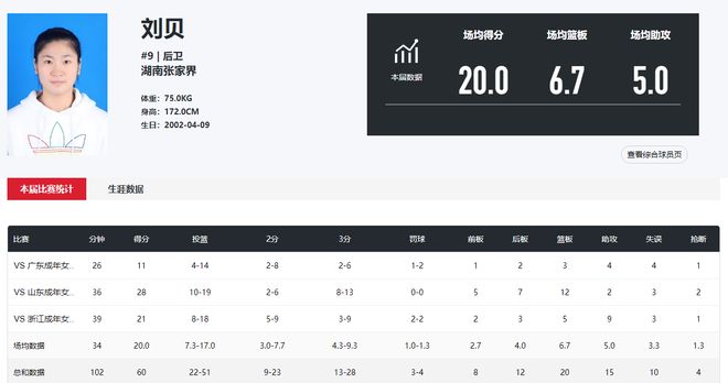 大运会结束后,刘贝代表湖北女篮征战了2025粤港澳全运会,出任首发控卫。她在对阵广东女篮的比赛得到11分3篮板4助攻,可惜湖北女篮实力比阵容豪华的广东队相差太多,遭遇57比105惨败。