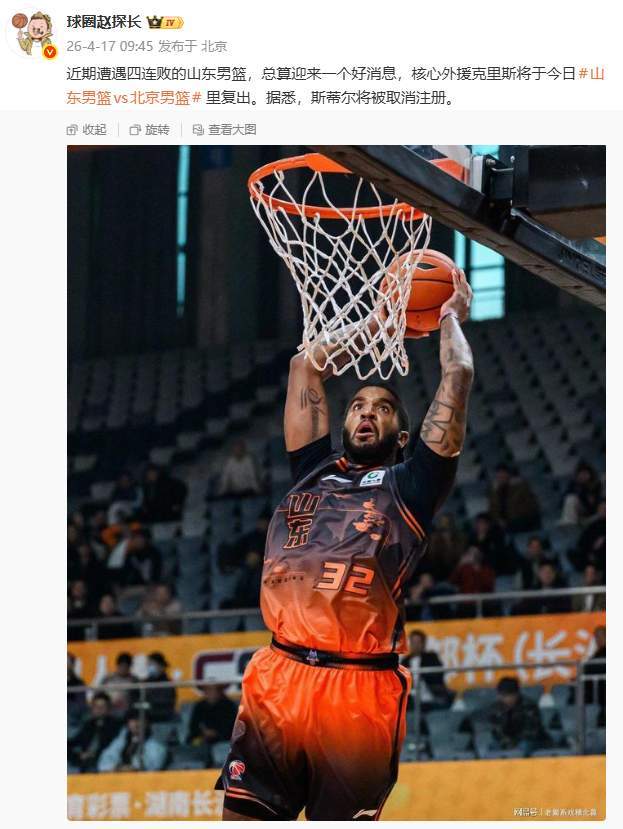 北京时间4月17日消息,CBA常规赛第40轮的焦点战即将在山东高速篮球馆打响,近期遭遇四连败的山东男篮终于迎来转机——核心外援马基斯·克里斯将在对阵北京北汽的比赛中伤愈复出,而此前的救火外援贝利·斯蒂尔则被取消注册。这一消息在球迷中引发热议,不少人对主教练邱彪的决策感到困惑,甚至质疑他"搞鬼",但仔细分析便会发现,这其实是球队在规则框架内的理性战术调整。
