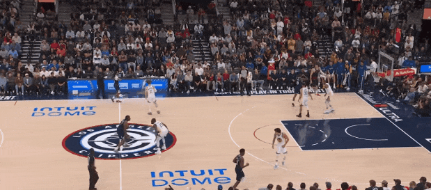 挺肚子抬右手的目的之一,是让裁判看见,“我是在用身体而非手去推他哦!”无球时伸手挠挠还好,对球时就得show your hand,这是卡鲁索和霍勒迪的爱好;当然,脚下跟得上,才能不靠手。莱纳德右肩推动了追梦下盘,但追梦上半身贴着,没让莱纳德推开。这是在干扰莱纳德的重心分配。莱纳德的中投需要极稳定的垂直起跳,追梦这非侵略性但持续的身体接触,让莱纳德在踩点时那一瞬间的“起跳发力点”找不到。对于巨星来说,这几厘米就是“好球”与“难投”的界限。