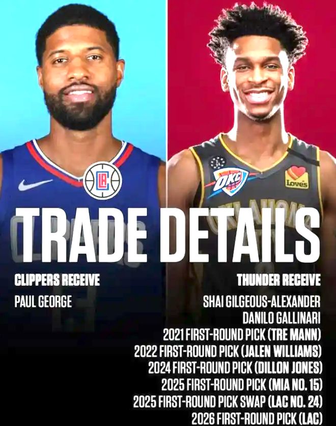 19年的夏季,刚率领猛龙夺冠的伦纳德成为自由球员,立刻引发联盟的疯抢,而处于洛杉矶的湖人、快船成为伦纳德最大的潜在下家,不过,由于詹姆斯刚到湖人,一山不容二虎,最终伦纳德选择加盟快船,但伦纳德加盟前要求快船不计一切代价得到保罗乔治。雷霆嗅到机会狮子大张口,直接挖空了快船所有的未来资产!于是一笔足以改变快船近10年历史的9换1交易达成,快船为了得到乔治,送走了亚历山大、加里纳利以及5个无保护首轮、2个首轮互换权。