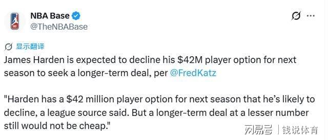 北京时间4月17日,知名体育媒体The Athletic(TA)援引联盟消息人士消息爆料,哈登下赛季手握价值4200万美元的球员选项,从目前局势来看,他大概率会选择跳出合同。即便哈登后续签下的新合同年薪有所降低,但凭借其赛场影响力,这份长期合同的薪资总价依旧会处于联盟顶尖水准,数额十分可观。