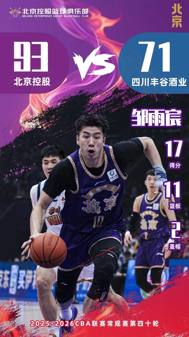 4月17日,北控男篮迎来常规赛最后一个主场对阵四川男篮,在经历了三节状态低迷的缠斗后,球队凭借末节强势发力,不断扩大领先优势,最终以93:71拿下比赛,收获3连胜。