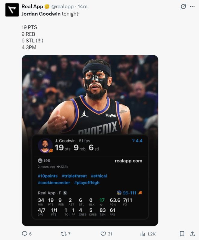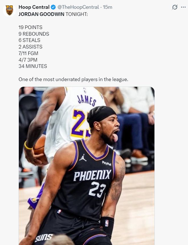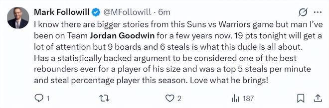 太阳记者:老实说我支持古德温已经好几年了,他拿到19+9+6抢断非常出色,在同体型的球员中他是联盟最出色的篮板手之一,本赛季他的抢断次数联盟前五。