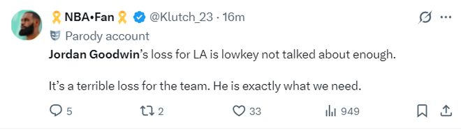 湖人媒体:古德温的离开对于LAL来说很惨烈,他的离队不该没人提及,他对于我们来说是巨大的损失,我们很需要他这样的球员。(2025年7月湖人为了签下斯马特裁掉了古德温,随后太阳认领了古德温)
