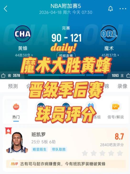 这场收官大战看得人心弦紧绷——东部赛场,魔术坐镇安利中心,以121比90完胜黄蜂,全程掌控节奏,未给对手丝毫喘息空间。全队五名首发悉数得分上双,保罗·班切罗火力全开,狂揽25分、5篮板、6助攻,率队毫无悬念摘得东部第八席位,将在季后赛首轮迎战底特律活塞。