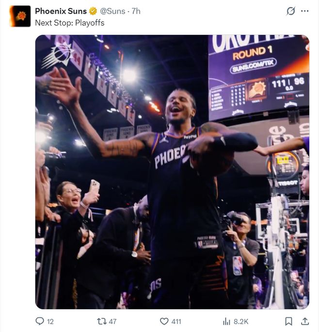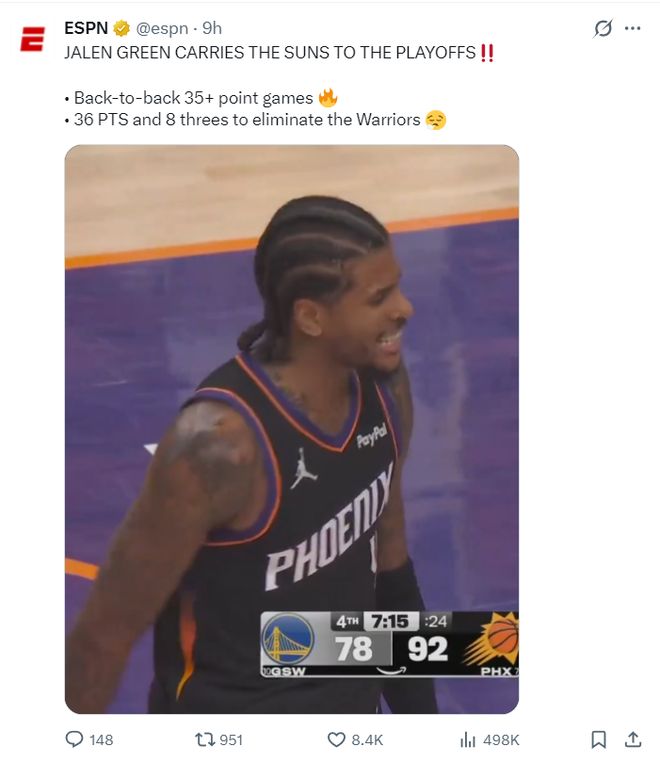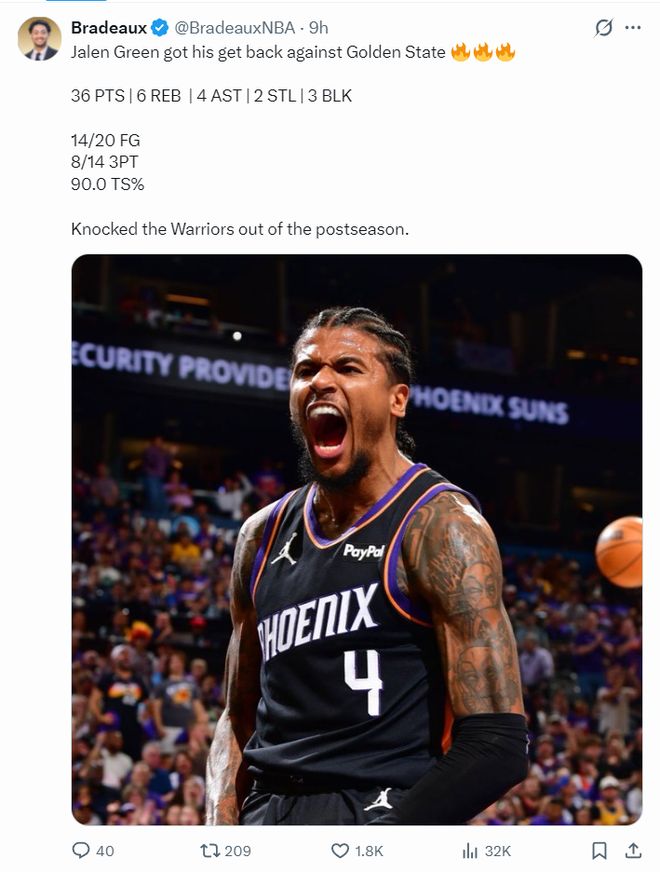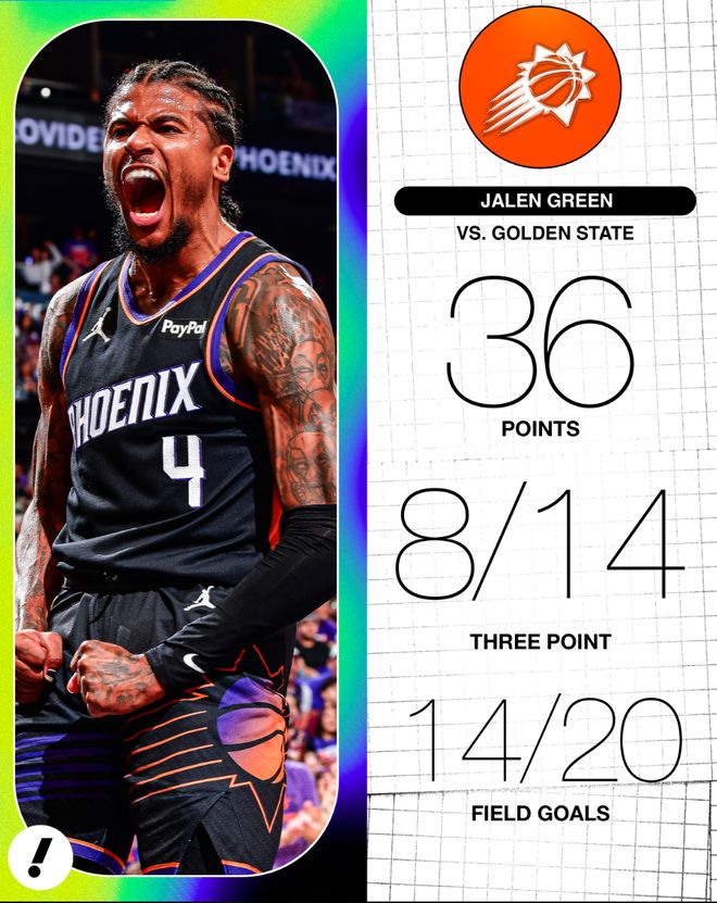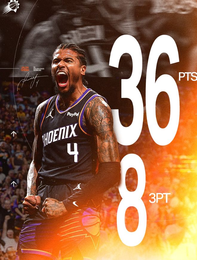 赛后杰伦-格林在主场受到了凤凰城球迷的欢呼/呐喊,他附加赛G1拿到35分2个三分球,附加赛两场比赛格林合计拿到71分+10个三分球,场均35.5分5.5板1.0断2.0帽,命中率57%,三分球命中率47%。