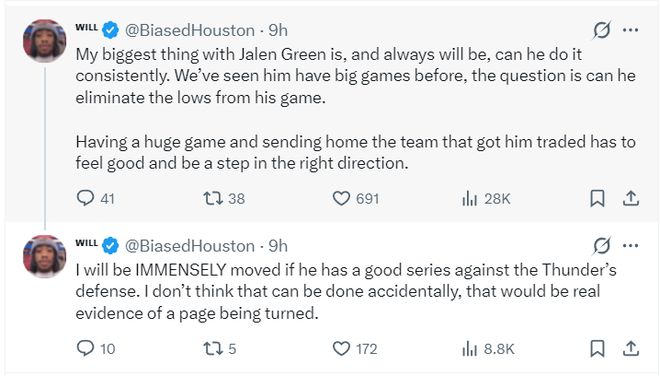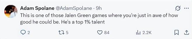 火箭记者Adam Spolane写到:这场是杰伦-格林堪称完美的表演,他展现出了超凡的天赋令人惊叹,他就是金字塔尖百分之一的天赋。