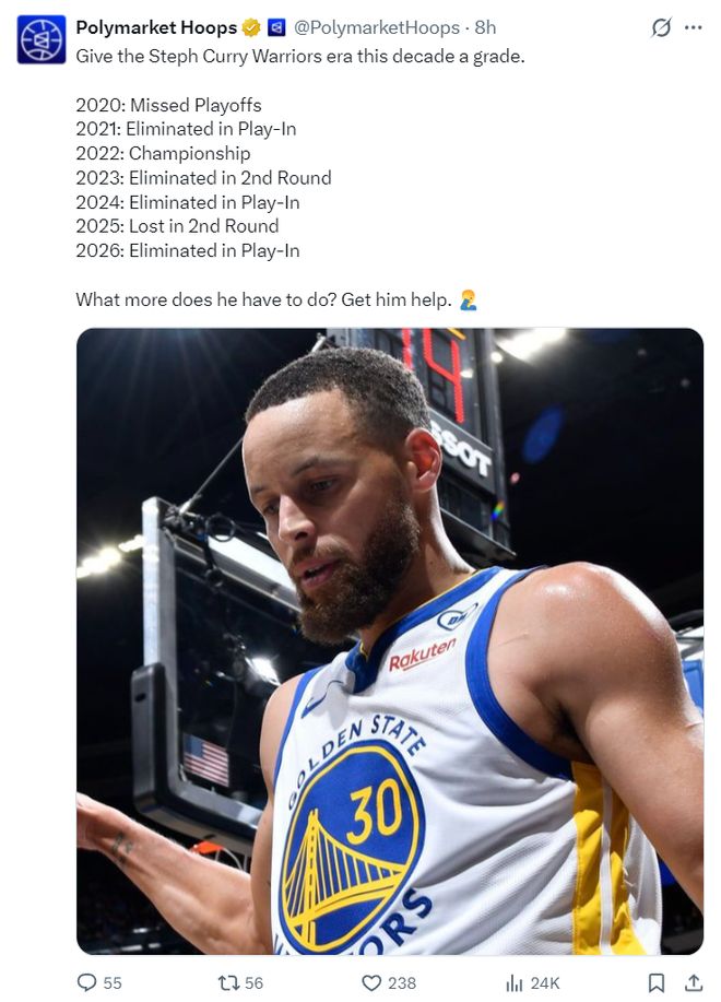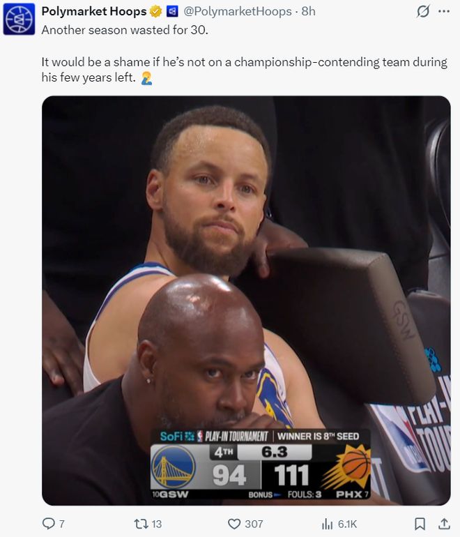 数据媒体写道:库里又浪费了一个赛季,如果在他职业生涯余下的几年里无法成为争冠球队,那么真太遗憾了。